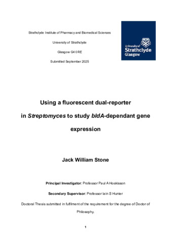 - With rising antimicrobial resistance, new strategies are needed to discover and improve antibiotics. Improved genetic tools may accelerate antibiotic discovery and production. Many existing antimicrobial compounds are natural products of Streptomyces bacteria. In Streptomyces, the Leucine-tRNAUAA (encoded by bldA) decodes the rare TTA codon, and loss of bldA results in deficiencies in aerial hyphae, sporulation and antibiotic production. Expression of bldA is reported to be repressed by the global regulator BldD in Streptomyces coelicolor. Reporter assays, including fluorescent proteins and RNA aptamers, are widely used to monitor gene regulation, and their combination offers a promising genetic tool. This thesis describes the design, construction, and validation of the ‘Broccomyces ‘dualreporter system, which combines the Broccoli aptamer (transcriptional output) and a modified version of mCherry (TTA-mCherry, translational output). Broccomyces was tested in S. coelicolor using the bldA translational control system. TTA-mCherry levels varied with bldA availability, confirming translational reporter viability, however the Broccoli transcriptional reporter was non-functional in liquid media. Unexpectedly, TTA-mCherry was also expressed in bldA-deficient backgrounds, suggesting alternative mechanisms for decoding rare codons. The Broccomyces system was further tested under the ccaR promoter in S. clavuligerus and demonstrated utility for quantifying the translational effects of 5`UTR mutations relevant to antibiotic production. TTA-mCherry detection in a bldA-deficient background prompted whole genome sequencing of a historical bldA- strain, highlighting hundreds of previously undocumented mutations, with potential regulatory effects. An isogenic bldA deletion strain in S. coelicolor M145 was subsequently created and characterised through complementation, metabolite profiling, utilisation assays and transcriptomics. Analysis indicates the bldA tRNA impacts far more than morphological development and antibiotic production. This work establishes Broccomyces as a versatile translational reporter and demonstrates the wider regulatory role of bldA, with implications for engineering antibiotic production in Streptomyces.