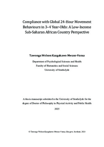 - Malawi, like other low-income sub-Saharan African (SSA) countries, is experiencing economic transition that may result in lifestyle changes, such as physical inactivity, increased sedentary behaviours, and poor nutrition. This shift may further increase the burden of movement behaviour-related non-communicable diseases (NCDs) and obesity in the country and globally. The 2019 global 24-hour movement behaviour guidelines for the under 5s were published to promote children’s healthy growth and development and to tackle NCDs and obesity globally. Despite publication over five years ago, there is limited evidence of compliance from low- and middle-income countries, particularly in SSA. Additionally, no studies have assessed feasible measurement methods for large-scale surveillance globally. Guided by the Behavioural Epidemiology Framework, this thesis provides novel evidence in the field of 24-hour movement behaviours in early childhood. Parent reports and daily step counts were validated against accelerometry for assessing total physical activity (TPA) in 3–4 year olds globally (Chapter 3). The step count threshold of 11,500 steps/day, equivalent to 180 minutes/day of TPA, provided valid measures but parent reports did not. This threshold was then used in cross-sectional studies to examine the prevalence and correlates of meeting the global guidelines (Chapters 4 and 5). Chapter 4 revealed that only 31% of 3-4 year olds from diverse backgrounds met the TPA guideline based on step counting, and compliance was influenced by sex, age, residence (urban/rural), and country income. Chapter 5, focused on Malawi, revealed relatively high prevalence (60%) of meeting all four 24-hour movement guidelines (physical activity, restrained sitting, screen time, sleep duration) among 3-4 year olds. Meeting guidelines was predominantly influenced by residential setting (23% urban versus 70% rural), suggesting that physical activity transition maybe underway particularly in urban areas. This thesis provides evidence to inform practical surveillance systems for monitoring movement behaviours among young children in resource-limited settings and can help develop tailored interventions to sustain healthy lifestyles during ongoing economic transformations, delay the physical activity transition, and reduce NCDs in Malawi and similar contexts.
